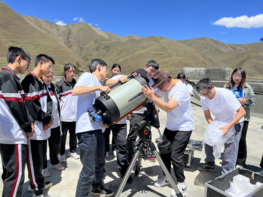 “向天空出發(fā)”公益幸福團(tuán)成員向?qū)W生講解天文望遠(yuǎn)鏡工作原理。