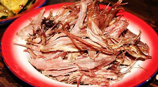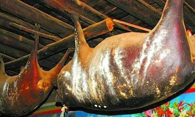 康南則用繩將豬勒死,讓血存于體內(nèi),然后用草點火去毛,于肛門處割一孔,取出內(nèi)臟,用干草或麥子等塞入豬腹內(nèi),用針縫合,縫口處用灶灰摻水攪合成糊密封,掛在室內(nèi),待其發(fā)酵,產(chǎn)生臭味時食用,稱“臭豬肉”。