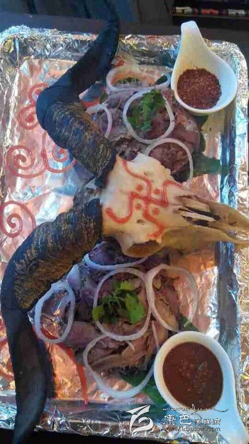 最值得一提的應(yīng)該是兩盤放在羊頭邊上的蘸料。一盤是四川的干辣椒面,里面放了鹽、味精、花椒,是大部分人都能接受的口味。而另一盤辣椒是西藏獨(dú)有的藏式辣椒醬,該辣椒的香辣和印度魔鬼椒有得一拼。藏式辣椒是使用涼水調(diào)和而成,只放一些鹽在里面,用羊頭肉沾上那么一點(diǎn)放在嘴里,立刻能感覺到辣味直襲你的味蕾神經(jīng)進(jìn)入你的大腦,形成一個(gè)字“辣”。如果你是不怕的,喜歡吃辣的食客,不妨試試這道“吉祥羊頭”帶給你的火爆。