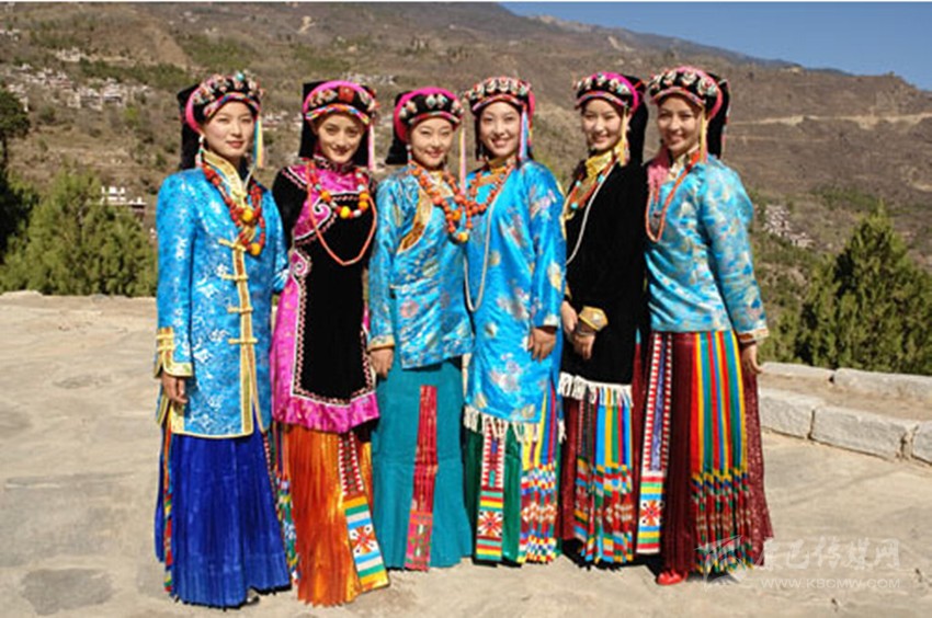以丹巴縣和康定縣大渡河沿岸為代表。康定魚(yú)通區(qū)和雅拉鄉(xiāng)一帶又自有特點(diǎn)。以長(zhǎng)方形黑金絲絨底繡花頭帕對(duì)折,戴于頭上,額前伸出約數(shù)厘米,腦后下披至后頸,寬至兩鬢,然后用大紅頭繩或五彩頭繩瓣發(fā)盤(pán)于帕上,辮子套各式辮飾。外披披風(fēng),一般是條紋白色或原初皮毛披風(fēng),內(nèi)穿錦緞上衣,下著五彩百褶長(zhǎng)裙,腰系絲織或綢質(zhì)彩色花腰帶,男戴金絲帽,足穿彩靴為風(fēng)彩。嘉絨地區(qū)服飾還受羌族習(xí)俗的影響,生活俗裝普遍穿長(zhǎng)等衫,以藍(lán)黑色為主,下身系圍腰,腰扎寬大彩帶,冬天穿羊皮褂或羊毛織成的無(wú)領(lǐng)服等。